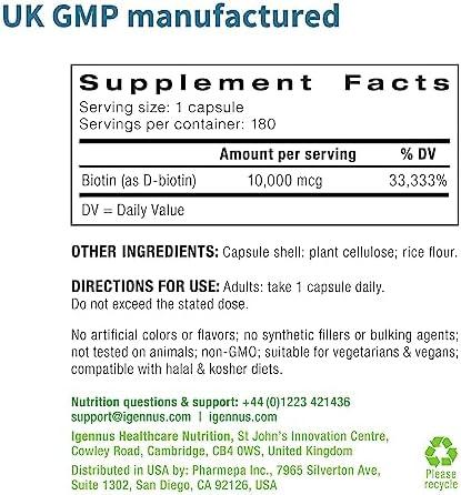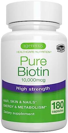 Pure Biotin 10,000mcg, High Strength, Clean Label, 180 Small Tablets, Lab Verified, & Vegan & Hypoallergenic, Supplement for Hair Growth, Skin & Nails, by Igennus Health & Household