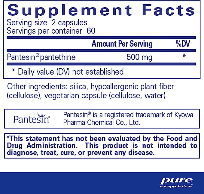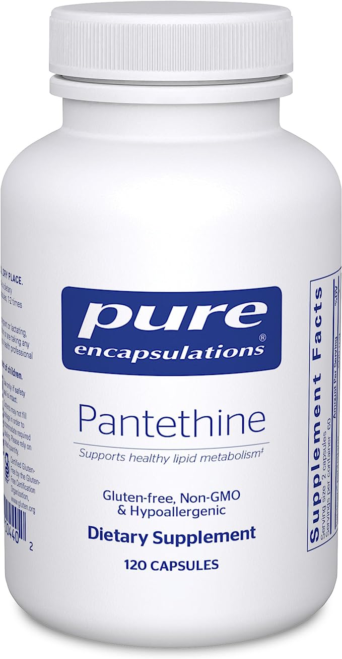 About this item Fatty Acid Metabolism: Pantethine is the active form of the B vitamin pantothenic acid and is a major component of coenzyme A, or CoA. In cells, CoA is essential for fatty acid transport and fatty acid metabolism.* Lipid Metabolism: Pantethine supports healthy triglyceride and lipid metabolism.* Cardiovascular Health: Several human studies demonstrate the ability of pantethine to maintain healthy utilization and metabolism of various lipids, promoting healthy cardiovascular function.* Pure Quality: Our supplements are made with only premium ingredients sourced from trusted suppliers and guided by our nutritional experts, then carefully manufactured and d to verify their potency and purity. Pure Difference: What makes us different isn’t just our process or what goes into our supplements — what we leave out matters, too. Pure Encapsulations products are FREE FROM wheat, eggs, tree nuts & peanuts, gluten, artificial colors, flavors & sweeteners, coatings and shellacs, GMOs, and unnecessary binders, fillers & preservatives.