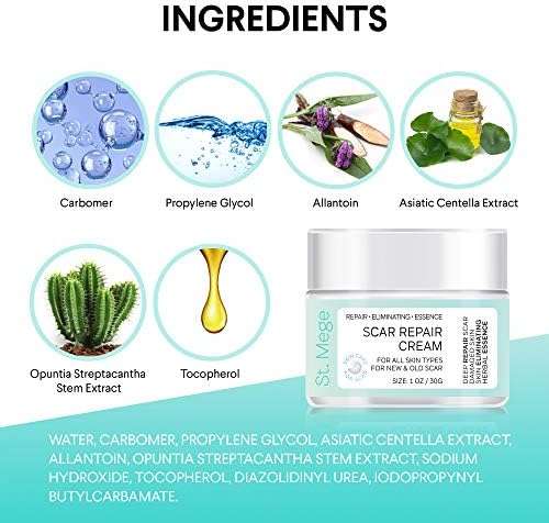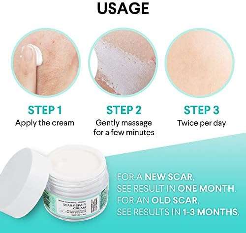 VERSATILE USE- This Scar Cream Cream works for many types of scars. It s an intensive solution for acne scars, surgery scars, stretch marks, C-section scars and scars from burns, cuts, and other injuries for Men and Women. NATURAL & GENTLE FORMULA – The natural formula is your skin s best friend. Formulated with premium ingredients to decrease irritation so you can confidently use the cream without any worries. The natural ingredients are key to boosting the healing and recovery of scars. With regular application. NOURISHES, STRENGTHENS, BRIGHTENS SKIN – Our special blend of nourishing and effective ingredients is suitable for all skin types including very sensitive skin, oily skin, dry skin, and combination skin types. Our scar repair cream enhances the skin s elasticity for firmer and smoother skin while softening, soothing, and repairing skin. EASY-TO-USE: Massage gently once or twice daily. Easily soften scar tissue and reduce pain with our repair cream. To even better hasten the healing process, protect your scar from the sun. FASTEST SCAR REMOVAL RESULTS Clinical studies show that new scars will go away in just 8 weeks and old scars will show results in 6-8 months. Remember that the age and severity of the scar will both impact the results shown, but all scars will show positive results!.