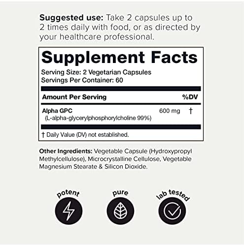 | Product benefits | Alpha GPC 600mg Concentrated Formula; 99%+ Highly Purified; 3rd Party Tested; 60 Servings |