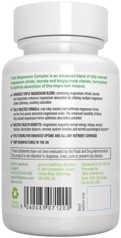 About this item ADVANCED MAGNESIUM TRIO: broad-spectrum health benefits from 3 bioavailable forms – glycinate (as bisglycinate) for sleep, calming mood &, stress; taurate for heart health, metabolism, leg cramps and muscle function, and citrate for energy HIGH ABSORPTION: single magnesium forms reach saturation fast. By combining 3 chelated and non-buffered forms, we target 3 uptake pathways, boosting the amount delivered to the body. Take morning and evening for all-day coverage PURE & CLEAN: vegan, non-GMO, hypoallergenic ingredients, no unpleasant fillers (silicon dioxide, magnesium stearate or titanium dioxide). Lab verified, UK GMP manufactured HIGH BIOAVAILABILITY FORMS: delivering elemental magnesium with potent, pure and effective chelated carriers glycinate and taurate plus non-buffered citrate. Gentle on the gut and free from poorly absorbed magnesium oxide which is only 4% bioavailable TRANSPARENCY GUARANTEED: magnesium labelling isn’t always clear as the carriers often bulk the content out. We deliver 262mg elemental magnesium from 2000mg bulk magnesium, per serving of 2 tablets
