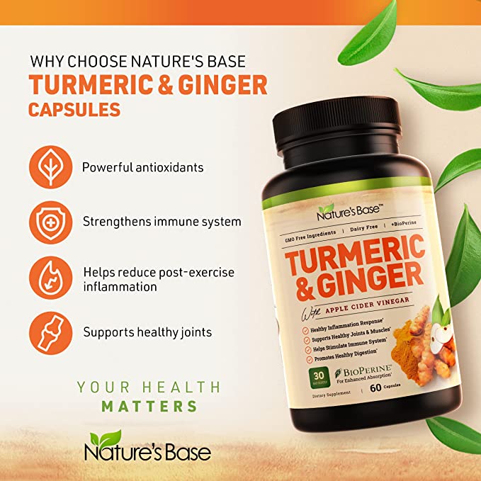 • Nature’s Base Turmeric & Ginger combines high-quality Turmeric Curcumin, Ginger, Apple Cider Vinegar, Hawthorn Berry, & Bioperine Black Pepper to create a powerful formula that may help reduce post-exercise inflammation and maintain joint mobility.