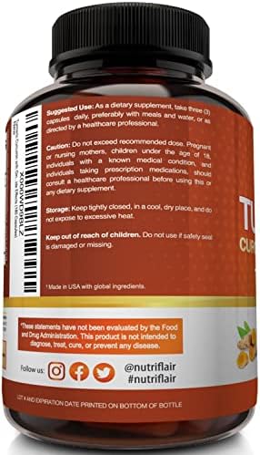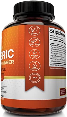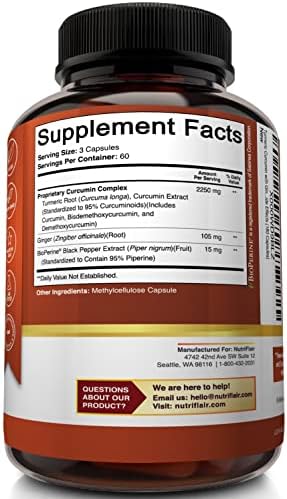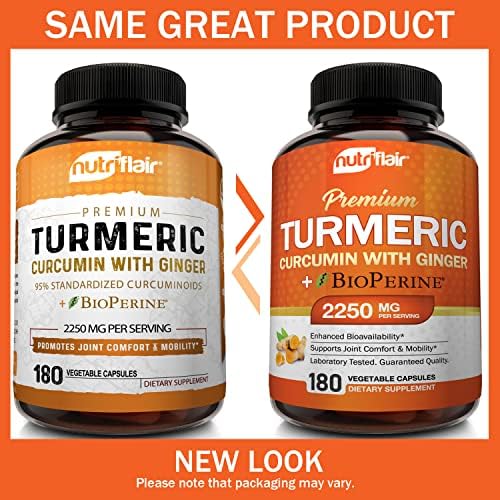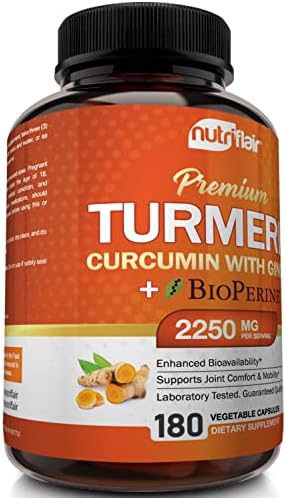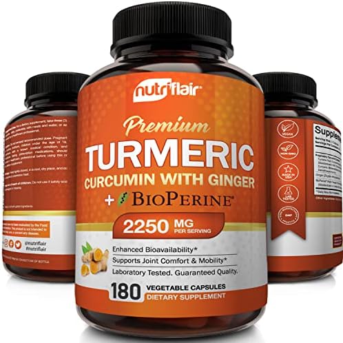 About this item Strong and Versatile Health Benefits Turmeric helps improve joint comfort and mobility, supports a healthy immune system, promotes cardiovascular health, stabilizes blood circulation, and supports hea Natural Nongmo and Vegan Our turmeric with ginger capsules are formulated with natural ingredients. The turmeric pills contain no GMO ingredients, hormones, preservatives, artificial ingredients, fill Tested and Trusted Ingredients Our nongmo, soyfree, glutenfree and dairyfree turmeric supplement is manufactured in the USA in a duly registered, approved, and inspected stateoftheart facility with a Trusted Brand and Satisfaction Assured If our turmeric complex supplements do not bring noticeable value to you and you don’t absolutely love them, your purchase is on us. No questions asked. Our worl Highest Potency Available with 2250mg per Serving NutriFlair’s turmeric pills enhanced with BioPerine have 2250 milligrams of turmeric curcumin and 95 percent total standardized curcuminoids per servi