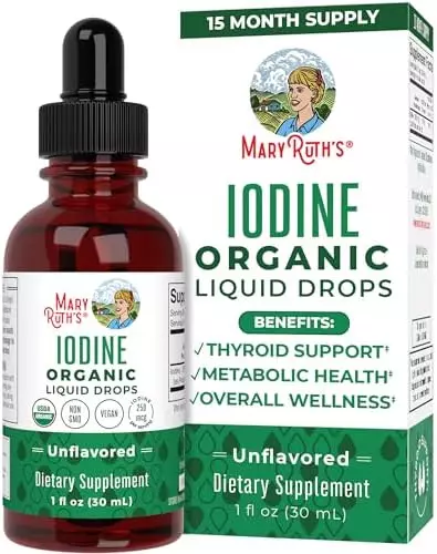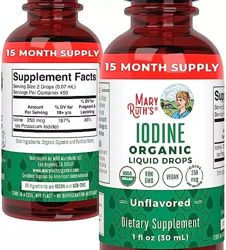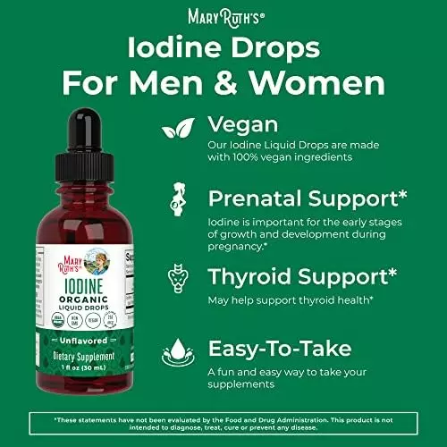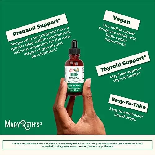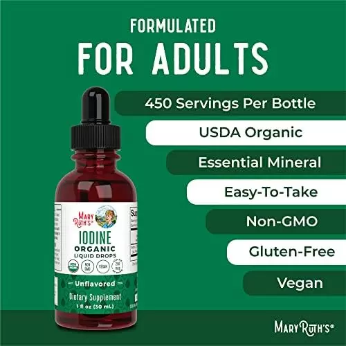 About this item POWERFUL LIQUID IODINE SUPPLEMENT – Your body doesn’t naturally produce iodine, so it is an essential part of any diet (vegans and vegetarians are at particular risk for iodine deficiency!). BE KIND TO YOUR THYROID – Iodine is especially important for thyroid health. The thyroid regulates hormone production, which in turn plays an important role in metabolism (weight management!), stimulating the immune system, and moderating the central nervous system. COMBAT IODINE DEFICIENCIES – Iodine deficiencies can lead to dry and brittle hair, skin, and nails, feeling fatigued and weak, and weight gain. MaryRuth’s Iodine Drops will help replenish these iodine deficiencies, helping you look and feel your best! EASY EFFICIENT ABSORPTION – Our easy to take, oral iodine drops result in faster, more efficient health support. They’re safe and effective for men and women. Each bottle contains 450 Servings, with a serving size of 2 drops and will last for more than a year.