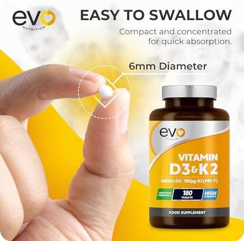 ✔ MAXIMUM POTENCY 6-MONTHS’ FULL SUPPLY – Just 1 high-strength vegetarian tablet per day provides 4,000IU of Vitamin D3 &100ug of Vitamin K2 MK-7 to help maintain a healthy immune system, bones, muscles and teeth (claims backed by EFSA). Our premium blend ensures that these vitamins are set at optimum dosages to safely deliver the full benefits of each active ingredient. ✔ VITAMIN D3 & VITAMIN K2 – A NATURAL PARTNERSHIP – Whilst Vitamin D helps in the maintenance of normal blood calcium levels and normal absorption of calcium (claims as substantiated by EFSA), Vitamin K is the nutrient that helps our body use that absorbed calcium effectively by directing it to the bones where it is needed and away from blood vessels and kidneys. ✔ EASY-TO-SWALLOW, VEGETARIAN TABLETS – Our supplement comes in 180 easy-to-swallow tablets, which are suitable for vegetarians. We only use premium, high quality, non-GMO ingredients. Our Vitamin D3 is sourced from lanolin (cholecalciferol) and the Vitamin K is MK-7 (Menaquinone-7), the form of K2 with the highest bioavailability and widely regarded as the gold standard of Vitamin K2. ✔ PRODUCED IN THE UK – Our Vitamin D3 & K2 tablets are formulated by healthcare professionals and produced in the UK to high quality control standards following GMP guidelines. EVO Nutrition are proud members of the Health Food Manufacturers Association (HFMA) and adhere to their regulations on compliance, product quality and safety for consumers. We are confident you’ll love this product as much as we do. ✔ ONE A DAY – Our tablets are designed to be easy-to-swallow and come in a 180 pack – meaning you can take the recommended one-a-day for a full 6 months’ supply of Vitamin D3 & K2.