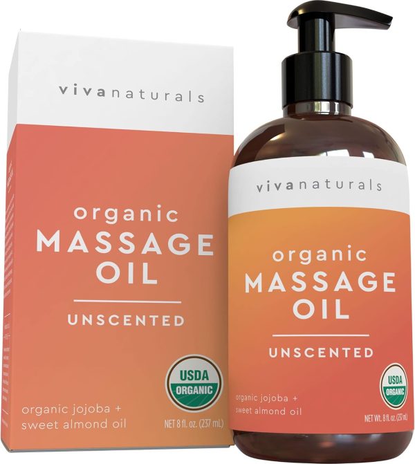 Viva Naturals Certified Organic Massage Oil, Unscented, Perfect for Couples Massage and Stiff Muscle Relief, Works Great as a Sensual Body Oil (8 fl. oz.)