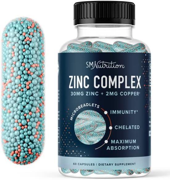 About this item ZINC AND COPPER COMBINED: Zinc supplementation alone may deplete copper absorption over time. Our 30 mg Zinc formula includes 2mg of Copper to help balance the absorption of both essential minerals.* MICROBEADLET TECHNOLOGY: Advanced microbeadlets create a time-conscious formula that bypasses stomach acid to be better absorbed in the intestinal tract. These beadlet capsules are gentler on the stomach and more effective than standard powder capsules. HIGHLY ABSORBABLE: Along with being microencapsulated, our Zinc and Copper variants are also chelated, meaning these essential minerals are bound to amino acids for thorough absorption. This is the zinc and copper supplement with optimal bioavailability. SUPPORT IMMUNITY & MORE: Zinc supplements for men and women help support immunity, hormone function, clear skin, & more.* Zinc and Copper supplements combined form a powerful antioxidant response to support immunity and fight oxidative stress, while Vitamin B6 provides energy and additional immune support.* THE SMNUTRITION DIFFERENCE: Advanced Zinc Microbeadlets are Vegan, Gluten-Free, Pesticide-Free, Kosher, formulated Non-GMO, and free from the Top 9 Allergens. Our formula is Third-Party Tested and manufactured in a facility that adheres to GMP standards.